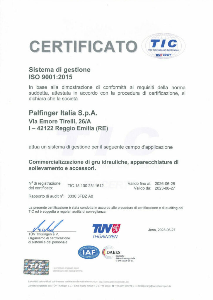 Palfinger Italia S.p.A. ha istituito ed attivato fin dal 2002 un sistema di gestione relativo alla commercializzazione di gru idrauliche, apparecchiature di sollevamento ed accessori.
